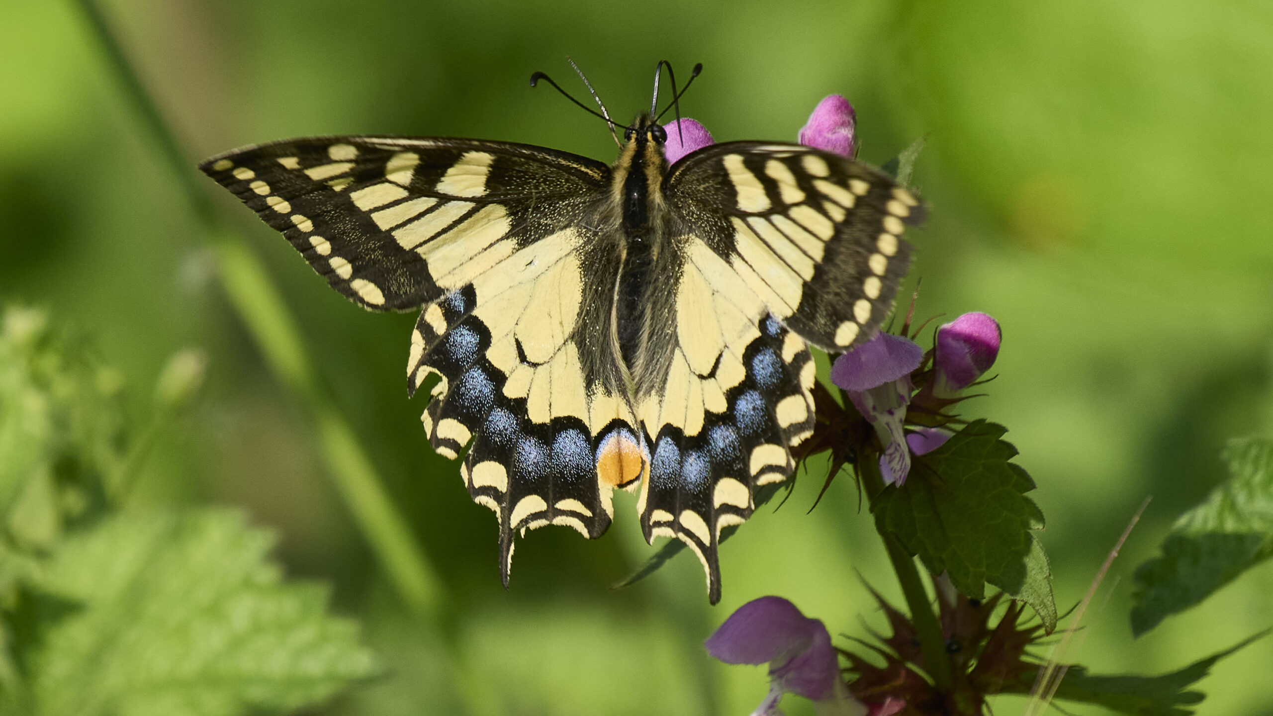 Der Schwalbenschwanz hat eine Flügelspannweite von 50 bis 75 Millimetern. Er ist gelb und schwarz gemustert mit einer blauen Binde und roten Augenflecken an der hinteren Innenseite der Hinterflügel. An den Hinterflügeln stehen kurze, größtenteils schwarz gefärbte „Schwänzchen“ ab. Er hat lange Haare an den Vorderbeinen, die als Putzkämmchen dienen.