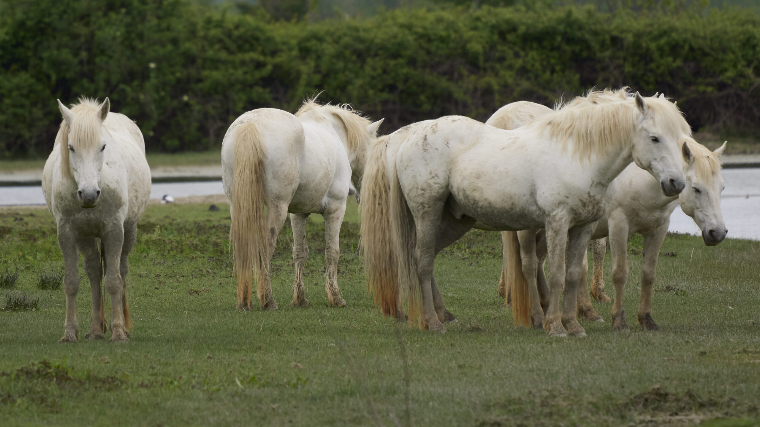 Das Camargue-Pferd ist im Allgemeinen ein kräftig, kompakt und harmonisch gebautes Pferd mittlerer Größe, das deutlich erkennbare Merkmale seiner iberischen und / oder berberischen Vorfahren aufweist. Die Fohlen sind bei der Geburt stets dunkelbraun bis schwarz, manchmal fuchs- oder falbfarben und oft mit einer weißen Blesse, hellen jedoch mit zunehmendem Alter auf. Mit etwa fünf, spätestens sieben Jahren sind sie vollkommen ausgeschimmelt.